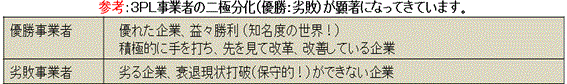 3PLは、利益体質の転換戦略の手段としてこれからも活用していくと思われます。荷主は、コア業務に特化するために物流力の強い企業(コストの安い?)に物流をはじめコア以外の業務を委託する動きが強くなってきています。そこで、物流業務を受託する企業の資質も考えてみたいと思います。物流ノウハウ(物流業務の実務能力、分析力、提案力、技術力、IT対応力)を蓄積していること、ネットワーク(情報インフラ、輸送網、拠点網)を備えていること、そして、3PL的思考(荷主に貢献すると共に3PL事業者にも応分のメリットが享受できること)を持っていることが必須条件であると考えます。さらに、物流事業者が荷主に対して荷主側の立場で、物流改革を提案し、包括して物流業務を受託し遂行することと言われています。基本的には、物流の専門的なノウハウを持った第三者である物流事業者が荷主の立場にたって、物流の企画・設計・運営を行うと共に企業の重要な経営課題として注目されている物流サービスレベル(納期、品質・精度、ローコスト)の 向上に寄与することだと考えます。それは、3PL事業者が荷主の物流部門に成り代わり、物流全体の企画、設計からリアル物流(実運用)を担うことだと考えます。さらに改善を続ける力量を持っていること、システム構築力、総合力が求められています。究極的には、荷主の売上増、物流コストの削減で荷主の成長に寄与できれば最高です。当然、荷主 と物流事業者という利益相反する関係による不都合を改善するために、荷主と3PL事業者の収益確保(ウィンウィンの関係)も求められる重要なポイントだと考えます。
