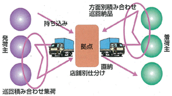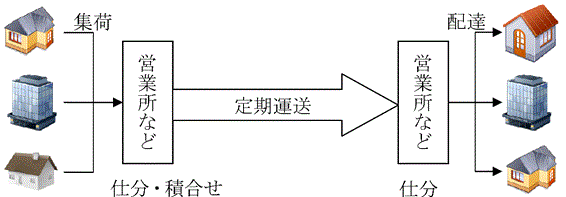 特別積合せ貨物運送を図示すると、以下のようになる(図1。以下、業界用語にならって「特別積合せ貨物運送」を「特積み」という)。