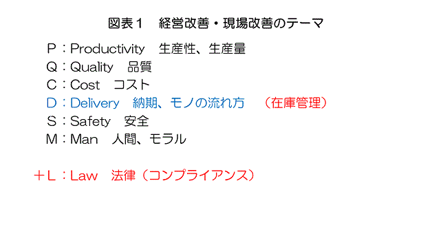 現場改善のテーマとしては、図表1のようにP・Q・C・D・S・Mが挙げられる。テーマ選択の順序がこの通りでないことは言うまでもない。