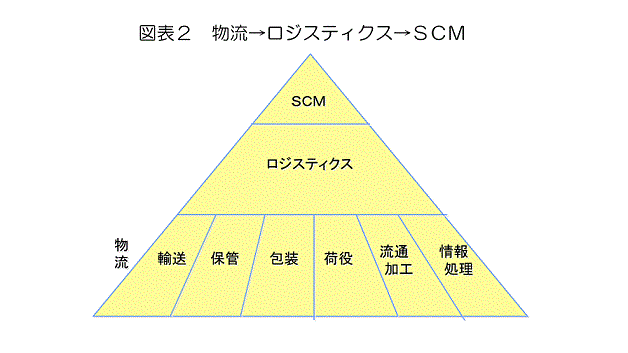 図表の下方には、物流の6機能が描かれており、それが物流からロジスティクス、そしてSCMへと上に向かって発展していく。SCMの基礎にはロジスティクスが、ロジスティクスの基礎には物流がある。逆に言えば、SCMやロジスティクスを構築するには、その足腰である物流の各機能を鍛えておかねばならない。