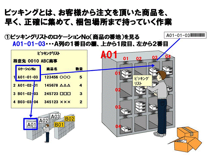 物流作業動画で研究した後、教育マニュアルを作成することになるが、新人パート目線が必須である。専門用語は出来るだけ少なく、写真付きで、わかりやすくするのが原則である。(図1参照)。ピッキングとは何か? ロケーションのルールは? どの部分で確認をすれば良いのか? ひとつ用語がひっかかってしまうと、色々と説明を受けても頭に入らないものである。