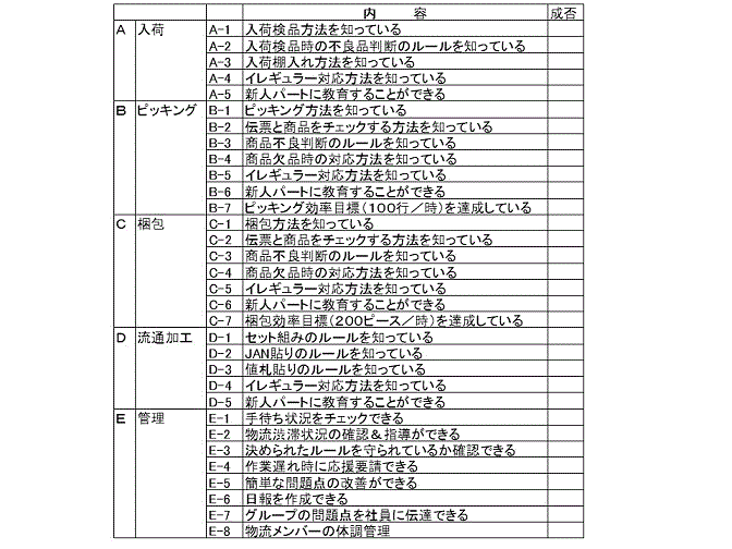 細かく評価基準を作れば〇×で可視化でき、パートと共有化することができる。長期パートに物流管理の一部を委任するパートリーダーの育成は短期間では難しいかもしれないが、適任者には時間をかけて依頼していけばよい。