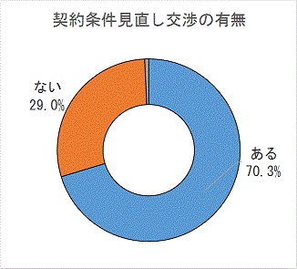 ではカウンターパートとなるトラック会社側はどう対応しているだろうか。これについては、例えば国土交通省が実施した「トラック運送業における原価計算に関する調査」の中で、「契約条件見直し交渉の有無」の調査が行われている。同調査によると、見直し交渉が「ある」と答えた企業が70.3%で、「ない」の29.0%を大きく上回っている(下図)。同調査では「見直し交渉のうち成功例の割合」についても調査されているのだが、この結果によると、成功の割合が「2割前後」とする回答が31.7%、「ゼロに近く、ほとんどうまくいかない」が31.7%に留まっており、交渉が苦戦している様が伺える(注2)。
