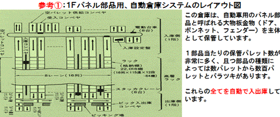 参考①は、自動車用のパネル部品と呼ばれる大物板金物(ドア、ボンネット、フェンダー)などを主体に保管している倉庫で、1部品当りの保管パレット数が非常に多く、且つ部品の種類によっては数パレットから数百パレットとバラツキがあります。