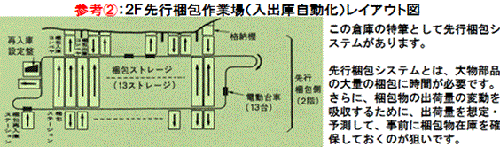 参考②は、パネル部品自動倉庫の荷捌き作業場の上階(2F)に位置した先行梱包(入出庫自動化)作業場のレイアウトです。