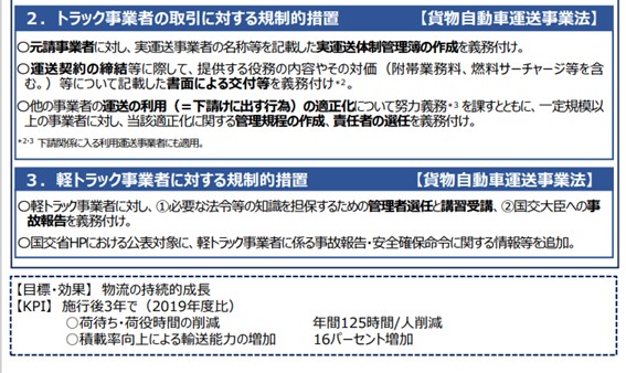 2024年4月23日に改正・可決した事業法では、トラック運送業者の取引に対する規制的措置として、以下の内容が定められた。施行は2025年4月とされている。