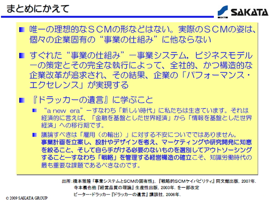 では、”本来の意味での”SCMの概念を組み込んだような新しい事業システム、事業の仕組みというものを、どんなふうに作っていったらよいのだろうか。それを作っていく事ができれば、経営品質の向上も図れるという事になると思います。この、新しいビジネスの仕組みを実際問題として、どのように作っていったらよいのだろうかという事は、現在、他の先生方と一緒に研究調査を行っているところです。
