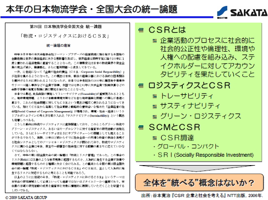 *画像をClickすると「物流・ロジスティクスにおけるCSR」http://www.logistics-society.jp/annai09.pdfの内容が見られます。(下段の緑色の矢印ボタンを押すとフルサイズで表示されます)