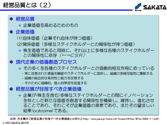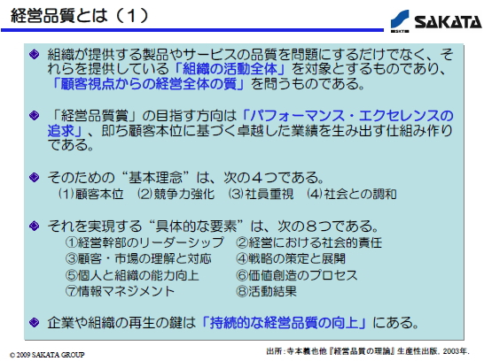 今日は時間の関係で、経営品質とは何かについては詳しくお話はできないのですが、少しだけご紹介しておきますと、「経営品質というのは単なる製品やサービスの質を問題にするだけではない。組織活動全体を対象にする。或いは顧客視点からの経営全体の質を問う。」というような事が指摘されています。