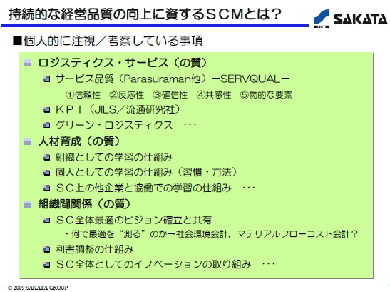 3点目ですが、組織間関係の質という事がスライドに書いてありますけども、例えば、サプライチェーン全体最適というような言葉がよく出てきますが、一体そのビジョンは誰が確立するのだろうかとか、あるいは、どういうふうに共有していったらよいのだろうかといったようなところです。また、最適というふうに言っても一体それを何で測るのか。例えば先程、國部先生にお話を頂いたマテリアルフローコスト会計、このようなものでサプライチェーンの最適というのを測っていくのだろうか・・・。これは私自身としての課題であり、いろいろ考えているところです。あとまた、利害調整の仕組みとかサプライチェーン全体としてのイノベーションの取り組み、このような事も考えていかなければいけないのではないかなと思っております。
