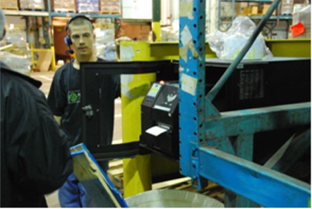 ⑦1オーダーのピッキング終了後、パレットを引いて出荷ヤードのラベルプリンターに行き、個人コードを読み上げる