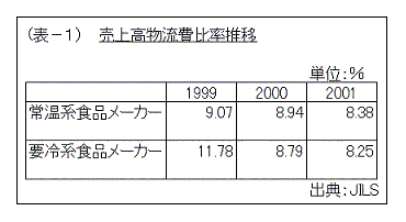 (表-1)に常温系と要冷系のメーカーにおける売上高物流費比率の推移を示す。2000年度からデータが逆転しており、低温系食品メーカーの方が低レベルということになっている。実勢運賃においては低温系が常温系に接近しており、回転力の高い商品を持つメーカーであればこの結果は理解できる。つまり365日連続稼動を前提に売上高を伸ばせば固定費負担も軽減し、相対的に物流費は下げられる。