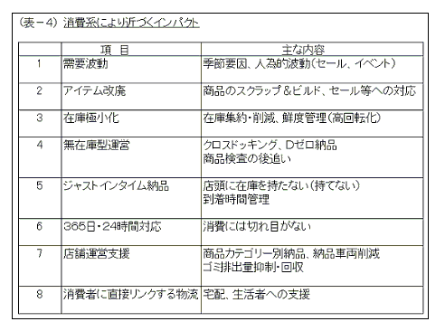 (表-4)に消費の波動に伴う各種リスクについて示す。要はこれをどう適確に予測し、計画化するかというSCMの根本的な課題、つまり消費起点のロジスティクスに組立て直すことが重要である。リスク管理という問題も複雑で、ハウツーを簡単に導入するということではなく、自らが実践で学ぶしかないだろう。