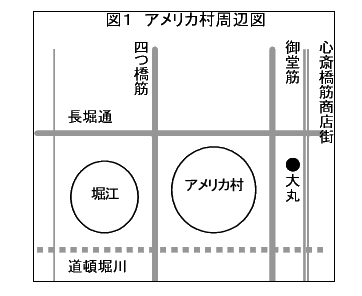 大阪中心部の商業地は大きく「キタ」と「ミナミ」に区別されるが,アメリカ村はミナミの中心地である心斎橋地域から見て西側に位置する。より具体的には,北側を長堀通り,東は御堂筋,南は道頓堀川,西は四つ橋筋に囲まれた地域(西心斎橋1丁目,2丁目)であり,主に店舗が密集しているのは通称三角公園を中心とした半径100メートルほどの地域である(図1参照)。