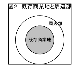 新しい商業地の形成を捉える上でポイントとなるのは,店舗の立地行動である。一般的に商業・サービス業の店舗は,他の店舗の近隣に立地しようとする集積の傾向がある。これは他店が吸引した買い手を,自分の店舗にも引き込む可能性ができるからに他ならない。このような集積的な立地行動が商業地を形成することになる。 しかし,このような集積的な立地行動が若干異なった形で行われるときに,新しい商業地形成のきっかけが生まれることになる。今,図2のような2重の円を考えることにしよう。内側の円は既存の商業地である。多くの店舗が立地しており,人通りも多い。そして,その外側の円は商業地の周辺部である。住宅や駐車場,倉庫,事務所など,店舗以外の施設が多い地域である。