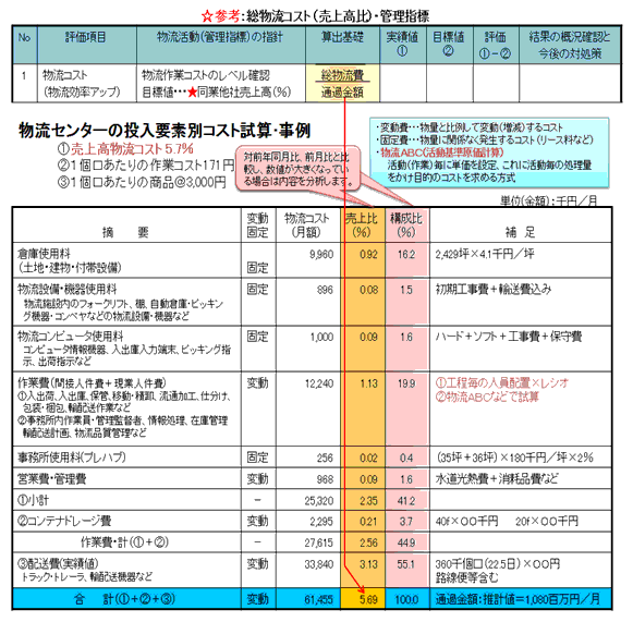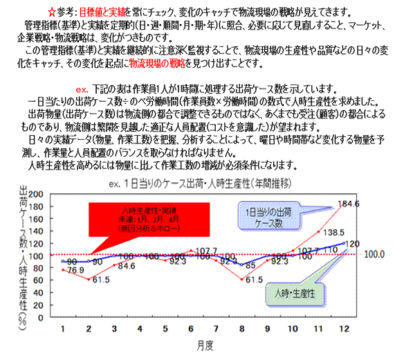 物流管理のアプローチの切り口として沢山ありますが、問題をクローズアップさせるのに分りやすいのが目標(過去の実績、前年同月比、業界標準値、同業他社比など)と実績値(数値化)を比較することです。