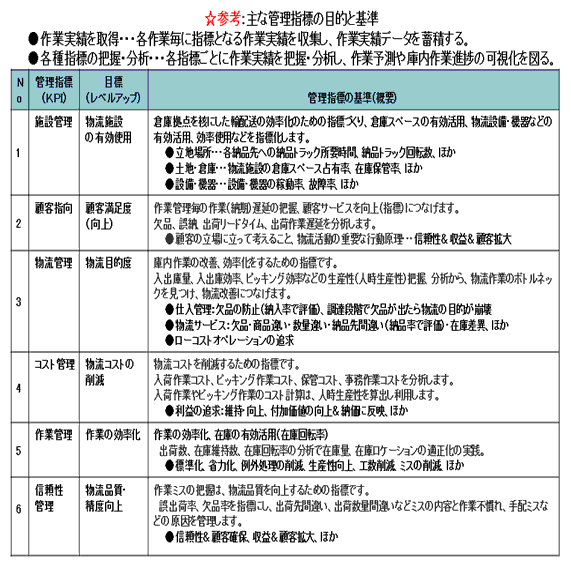 物流業務全体の仕組みを知ること、物流実務で与えられたリソースをどのように使っているかを知ること、管理指標(基準)の目的は、物流管理と顧客指向(利益貢献度)、顧客満足度、物流コストの削減、作業の合理化・効率化(保管効率)、物流品質・精度の向上(荷役効率や作業品質の向上)、物流施設の有効利用などのパフォーマンスの向上に寄与するために活用していくものです。