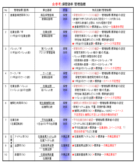 管理指標は、リアル物流(実務)の良い点、悪い点を見る努力をすることにより、業務改善の着眼点のポイントを探し出し、保管効率、荷役効率や作業品質の向上、利益貢献度などのパフォーマンスの向上に寄与するために活用していきたいものです。