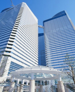 ※地上へ出て左折後、直進し黎明橋(れいめいばし)と並行してかかる「トリトンブリッジ」(動く歩道)を渡り、正面のエスカレーターを登りグランドロビーに出て、右側奥にオフイスタワーWのエントランスあり