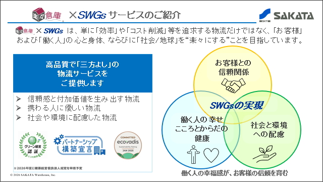 We introduce “Raku-raku soko × SWGs” as a logistics approach that effortlessly achieves not just logistics efficiency and cost reduction, but simultaneously fosters “trust with our customers,” “the happiness and physical and mental well-being of our workers,” and “consideration for society and the environment.”