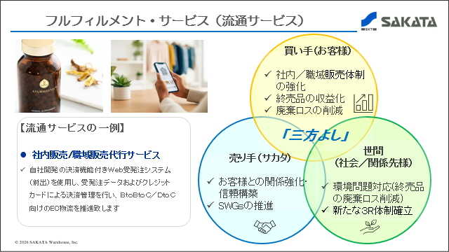 Additionally, we provide fulfillment services encompassing manufacturing, including packaging, labeling, and storage of cosmetics and quasi-drugs in warehouses compliant with the Pharmaceutical Affairs Law; distribution processing such as set assembly and shrink wrapping; and inspection, repair, and BTO (Build-to-Order) services in the electrical and industrial equipment sectors.