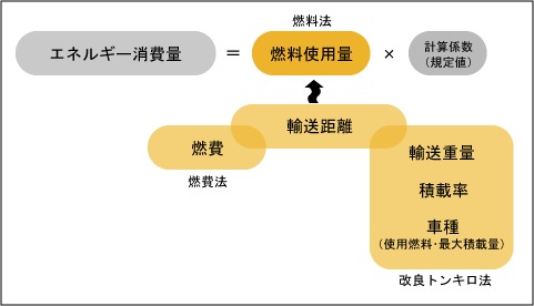 エネルギー消費量は、その燃料がどのくらいの熱量を持っているかを基準に算定されるため、計算に使う値の、燃料使用量への換算精度が高い程、正確な値を求めることができる。このため、燃料使用量から直接計算を行う「燃料法」が最も精度が高く、次いで「燃費法」、「改良トンキロ法」であるとされている。