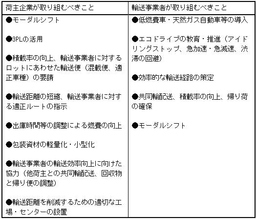 運輸部門においては、すべての企業に省エネ対策(表1)を講じることを求めるほか、一定の要件*を満たす輸送事業者(運ぶ側)・荷主企業(運ばせる側)に、定期報告書によるエネルギー消費量の報告やエネルギー使用原単位**の前年比1%削減を目標とする省エネ計画の策定を義務付け、必要な対応を行わない企業については、社名の公表や罰金といった法的措置を設けている。よく耳にするCO2も、その排出量をエネルギー消費量と併せて定期報告書にて報告するものであるが、これは実際には、同時期に施行された改正温対法(地球温暖化対策に関する法律の一部を改正する法律:一定の要件を満たす企業に温室効果ガス排出量の報告を義務付ける)に係る報告となっている。