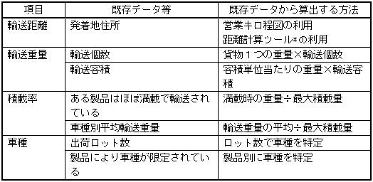 まず、自社の物流が現状どのような内容で数値化されているのかを把握し、その上で、算定上利用可能なデータはどれか、新たに必要となる要素が何であるかを洗い出す(図1)。直接把握できないまでも、既存のデータから辿り得る値はないだろうか?自社固有の数値化されていない慣例もあるだろう。それを数値に当てはめれば、有効な値が得られるかもしれない。表2に例を挙げる。