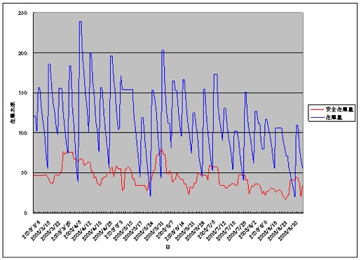 この理論は既に使い古された感があるが、売れ行きの安定した定番品で調達リードタイムが短い場合には抜群の効果を発揮する。また、Microsoft Excelの関数の知識とVisual Basicの知識があれば、日々の需要(出荷)データからシミュレーションを行うことができ、在庫理論に基づいた発注をしていれば指定した欠品率内で出荷が滞りなく行えることをビジュアルに証明することが可能である。図1にその一例を示す。このように過去実績からはっきりとしたシミュレーション結果を示すことができるため、例えその在庫が現実の在庫よりはるかに少なくても、現場から出てくる過少在庫の不安を取り除くことができる。