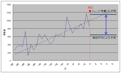 在庫理論が季節商品に適用できないといわれるのは、需要トレンドが上昇または下降しているにもかかわらず過去需要の平均で需要予測しているためである。従ってその場合には、単に過去の需要平均を用いるのではなく、過去の需要トレンドを延長することにより次のサイクル期間の需要を予測すればよい。図2に需要トレンドを考慮することによる効果の例を示す。
