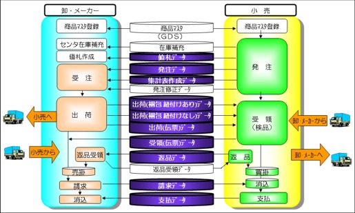 流通業界での特徴的なEDIは、小売から卸・メーカに注文を出すEOS(*1)です。これは、1980年に制定されたJCA手順(*2)をベースにしたデータ交換で行われています。つまり、30年前に作られた、今となっては超旧式のEDIなのです。先進業界では、1990年頃よりこの従来型EDIの問題点解決のため、いろいろ対策が打たれてきました。流通業界でも、通信プロトコルでは1991年にJCA-H手順(*3)、メッセージでは1997年のJEDICOS(*4)や2002年のJEDICOS-XML(*5)といろいろ挑戦を続けています。しかし、いまひとつ決定打となるものはなく、今日もなお従来型EDIとしてJCA手順が主流となっているのです。