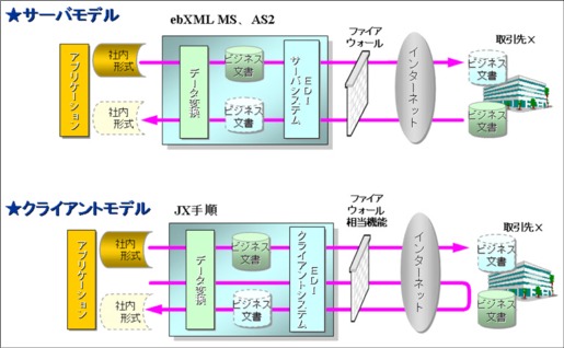 運用の規模と形態により分かれます。データサイズが1通信10MBを超えるような場合は、サーバモデルをお勧めします。これはPush型通信になりますので、通信の集中を避けることができ、通信と業務の平準化が可能となります。通信プロトコルはebXML MSもしくはAS2です。また接続先にクライアントモデルを使う企業がある場合、JX手順サーバプロトコルも用意する必要があります。運用は24時間常時稼動となります。