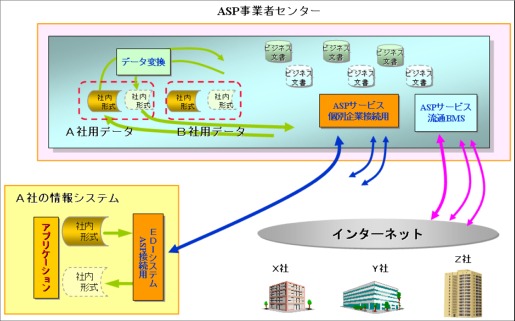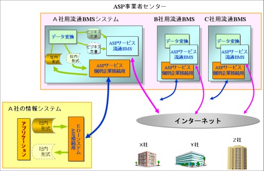 ASPの形態には2種類あり、自社専用のシステムを構築し完全に独立した運用を委託する場合(ハウジング)と、汎用の流通BMSサービスへの参加企業として利用する場合(ホスティング)とがあります。