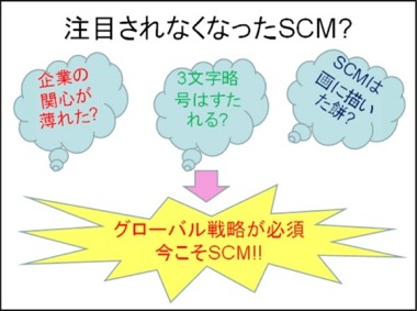 数年前、非常にSCMということが話題になりまして、例えば本屋さんの専門書の棚には、SCM関連の本がずらっと並んでいたのですが、最近専門店の本屋さんへ行ってもSCMの本というのは隅の方に置いてあったりして、非常に寂しい現状です。