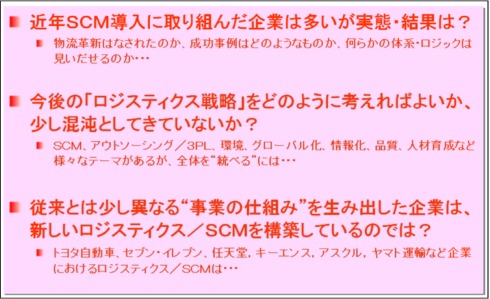 3つ目は、本日私が一番お話をしたい点でもありますが、どうも従来とは少し異なった”事業の仕組み”のようなものを生み出した企業では、同時にといいますか、並行してといいますか、その前提としてと申しますか、新しいロジスティクスあるいはSCMを構築しているのではないだろうかということです。トヨタさんとか、セブン・イレブンさんとか、このスライドに企業名が出ておりますけれども、何やらユニークな”事業の仕組み”を生み出していると思われる企業に、私たちは学ぶところがあるのではないか。これらの企業のロジスティクスやSCMに何かヒントはないだろうか。
