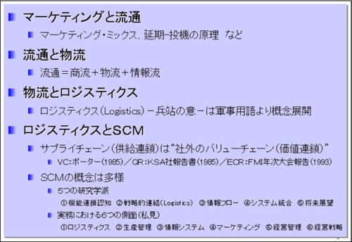 まずは「ロジスティクスやSCMを取り巻く概念の整理」です。最初のあたりのマーケティングや流通に関しては、この後、講師の諸先生方から、より詳しいお話をいただけると思っておりますし、本日お集まりの皆様方は既にご存知のことが多いと思いますので、私からは詳しくお話する必要がないかと思います。