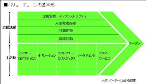 これはもうご存知の方も多いかと思いますが、「バリューチェーンの基本形」と呼ばれるものです。このグリーンの図、これが一つの企業、皆様方の会社というように捉えてください。ハーバード大学のマイケル・ポーター教授-経営戦略の分野では非常に有名な先生ですけども-、この先生が、日本では85年に翻訳されました『競争優位の戦略』という著書の中で、バリューチェーンという概念、価値連鎖という概念について説明をされておられます。詳しい内容については、もし興味があればレジュメの後ろに引用文献を書いておりますので、また後日ご覧になられてはと思います。