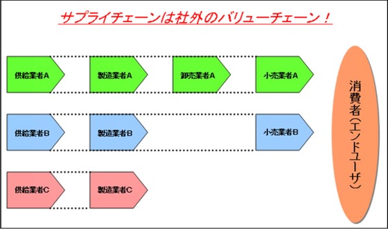 たとえば皆様方から見て図の右端のほうに小売業がありますが、小売業としては当然、卸さんとの関係、メーカーさんとの関係、さらには原材料の供給業者/サプライヤーさんとの関係、こういうものが実際のビジネスの現場では関係しています。そして、最終のお客様に対して価値を提供していくということになりますと、一つの企業の中でのバリューチェーンだけでなく、流通チャネルといいますか、マーケティングチャネルといいますか、流通経路全体がつながっている、チェーンのようになっているというようなことが必要になります。そうでないと、真の意味での競争優位には立てないということになります。そうした意味で”サプライチェーンは社外のバリューチェーンである”、こんな考え方が提唱されているわけです。