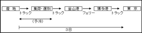 韓国にこの優れたビジネスモデルがある。(図―1参照)FTAの対策として始められたパプリカの対日輸出である。この商品は日本市場ではそもそもオランダ産が中心であったが、既に70%程度のシェアを獲得し大統領の表彰を受けている。寒冷地故にまず施設園芸としての通年栽培が基本であり、しかも水耕による無農薬栽培である。収穫後直ちに予冷し、それ以降低温トラック・フェリー・鉄道を乗り継いで、東京には3日後に到着する。これでは九州や北海道の産地と立地的に変わらない。何より健康食品としての訴求力がある。