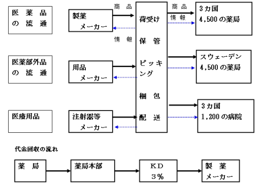 スウェーデンは福祉先進国というお国柄を反映して、国家による医薬品流通のへの関与と統制が長い間、続けられていました。薬価は国の決めた公定価格であり、しかも販売は国営薬局です。北欧全般に医薬品流通に対する国の関与は強いが、お隣の国デンマークでは既に民営です。スウェーデン国内の薬局数は約900店、卸売業は2社だけです。その1社が(KRONANS DROGHANDEL(以下KD)です。卸(KD)の顧客は薬局とメーカーです。取扱商品は医薬品の他、医療器具、介護器具、用品です。ヘルスケアと呼ばれるものは除外されています。流動食のようなものはヘルスケアと聞きました。いわゆる医薬部外品でしょうか。日本と定義・分類がちがうかも知れません。