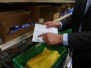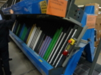 | ⑦ | “B,C”ラインのピッキングは完全マニュアルである。ピッキングリストを見て、ロケーションを探し、指定の個数をピッキングして、コンテナに入れる。複数のピッカーが1ライン入るので、色のついた洗濯はさみでマーキングし、他のピッカーと区別する。RFIDは何だったのか疑問が残る。「最初にRFIDありきの」のような気がする。「見える化」でなく、「見せる化」である。 |
