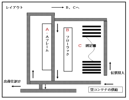 | ⑤ | コンテナは多頻度出荷の”A”低頻度出荷の”B.C”に分かれて流される。 |