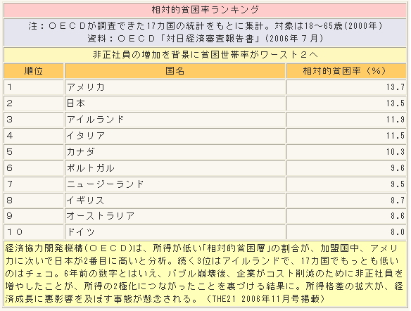 2007年の国民生活基礎調査では、日本の2006年の等価可処分所得の中央値(254万円)の半分(127万円)未満が、相対的貧困率の対象となる。これは、単身者では手取り所得が127万円、2人世帯では180万円、3人世帯では224万円、4人世帯では254万円に相当する。