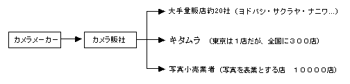 - カメラの有力販売店は全国で約300社、このうち15社は全国チェーン展開しており、販売額のシェアは70%に上る。これらの各社は自前の物流拠点を持っており、そこへフィルム類も含めて一括納品している。