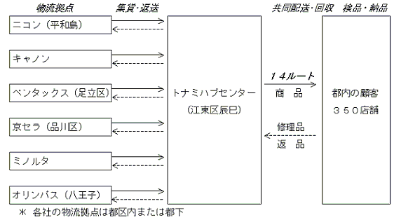 カメラ6社は95年、営業・物流担当から成る「カメラ共同物流協議会」を発足させ、各社の配送形態(チャーター車で商品を配送しながら修理品を回収)が類似し、かつ重複する店舗が多い東京地区での共配システムを検討。各社単独では積載率が2~3割と低いことから、共同化の効果が最も期待できる地区として17区を選択した。