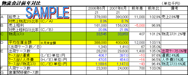 前年同月対比の分析は、物流がどの程度改善が進んでいるかを把握するために作成する必要がある。よく、鳥の目、虫の目という言葉を聞く。虫の目で小集団活動等の改善を進めて効果を出すが、鳥の目で全体の状況を把握しなければ本当の効果検証ができない。極端な例で言うと、作業改善でピッキング効率を10%改善すると部分的に改善効果はあったことになるが、効率アップをしても人を削減していないと人件費という視点では全体の効果が出ていないことになる。また、人件費が10%削減されて月間20万円改善されても、情報システムを導入した経費が月額21万円発生していれば、部分的には効果が出ていないことになる。この様に毎月の物量がどのくらいあり、それに対応した人員配置(もしくは残業費)になっているか、1ケース当りの人件費がどうなっているかを分析することで、問題点が見つかるのである。1ケース当りの平均運賃が増加している場合は、どういう理由で運賃が増加しているかを分析することで問題点が把握できる。