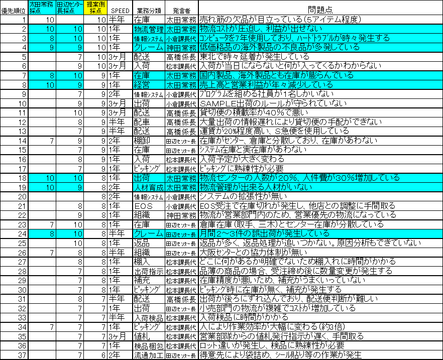 物流の問題点をリストアップした後に、経営者、主要物流メンバー、全部門の代表者に参加してもらい、すぐに改善に取り組まないといけない問題点を10点、半年先に取り組むべき問題点は8点、という様にルールを事前に決めておいて配点をしてもらう。点数付けで注意して頂きたいことは、他のメンバーに自分の配点を知られない様にして点数付けをして、後でまとめて入力することである。社長の配点を知った後で自分の配点を考えると、「自分は3点と思っていたが、社長が10点だと点数を変えないと何を言われるかわからない」と、余計な判断が入り本来の点数が変わってしまうからである。重要なのはそれぞれの考え方(何故重要と感じたのか、何故重要と感じなかったのか)を知り、「同じ情報を共有化した上で、全社で物流の問題に対してどう取り組むか」を考えていくことである。また、各部門の優先順位と全社の優先順位は当然変わる。全社での優先順位の中では、難易度が高いが各部門が協力すれば大きな効果が出る可能性が高い改善も出てくる。「物流の問題は物流で考えてよ」という当初の状況から、「物流の問題は全社で考える」という状況になれば、改善できる項目も増加するし、部門改善に比べて全社改善の方が効果は著しく大きい。