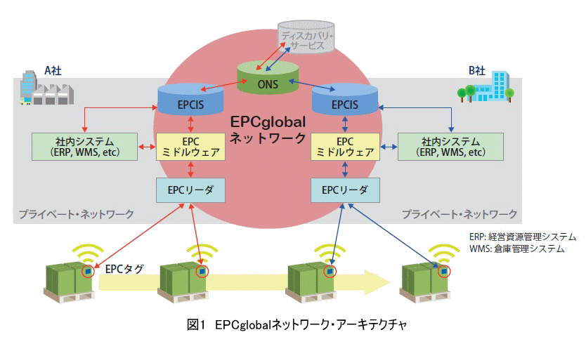 固有のID番号であるEPC(Electronic Product Code)が書き込まれた電子タグが「EPCタグ」、EPCタグのデータを読み書きする機能を持つ「EPCリーダ」、さらに複数のEPCリーダから受け取った電子タグ・データを、必要に応じて整理・集約し、アプリケーションに通知する機能をもった「EPCミドルウェア」、企業内や企業間の電子タグ・データの交換・共有を可能にするための電子タグ・データの蓄積・検索のしくみである「EPCIS」などである。