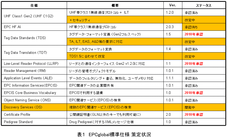 2011年1月現在、ディスカバリ・サービスを除くほぼ全てのコンポーネントに対応する仕様が策定済みである。標準仕様の策定状況は、表1の通りである。原文(英語)は、GS1/EPCglobalのウェブサイトからダウンロードできるほか、流通システム開発センターのウェブサイト「EPCglobal標準仕様/関連資料」では、日本語参考訳を無料で提供している。 関心のある方はぜひ利用していただきたい。