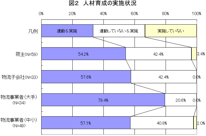 また、経営理念や経営戦略と人材育成の関連性を見ると、大手の物流事業者では約8割、荷主企業、物流子会社、中小の物流事業者において過半数以上の企業が、人材育成を経営と直結して取り組んでいる様子が窺える。